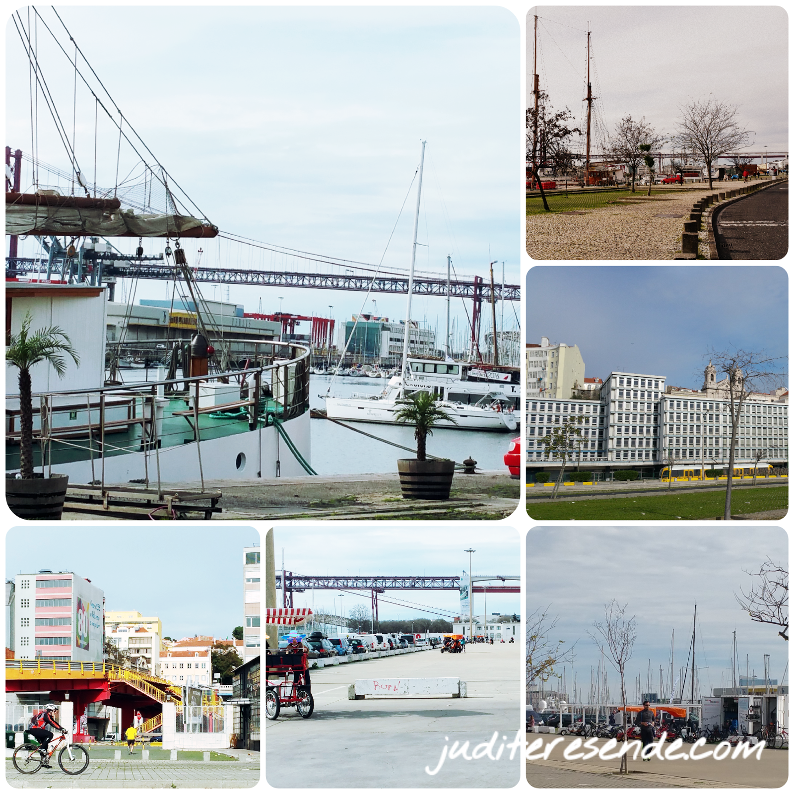 Mas hoje o destino é outro. Atravessando a avenida para o lado de lá da linha de comboio, aproximamos do porto. Daqui até Alcântara temos a companhia de barcos adormecidos no Tejo. E num espaço amplo, adultos e crianças divertem a manhã de Domingo com brincadeiras de 2 e 4 rodas.