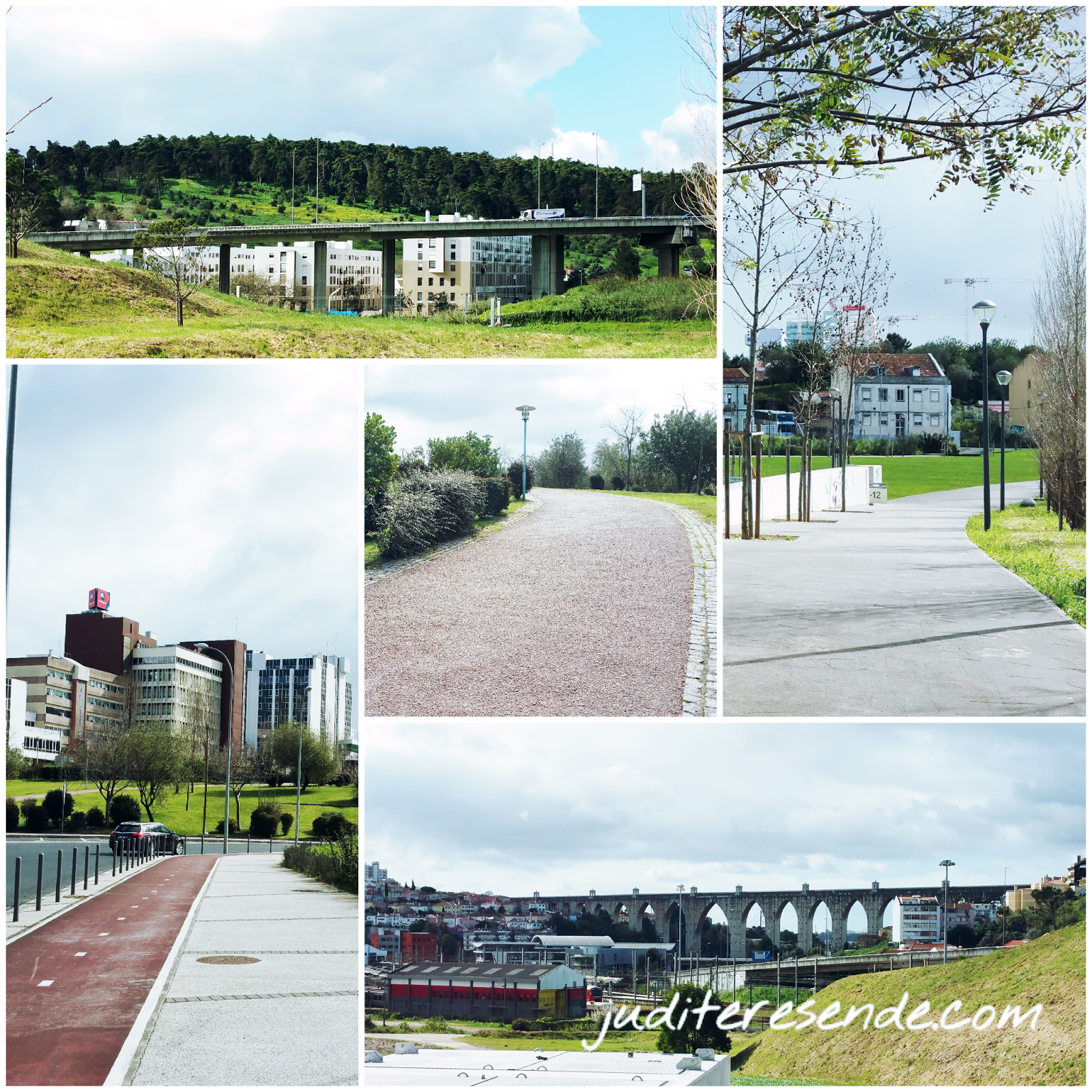 Já estava Equipada, por isso só precisava de estar a caminho do ponto inicial: a Rua de Campolide: mesmo sob o Parque Florestal de Monsanto e uma vista lindíssima sobre o Aqueduto das Águas Livres.